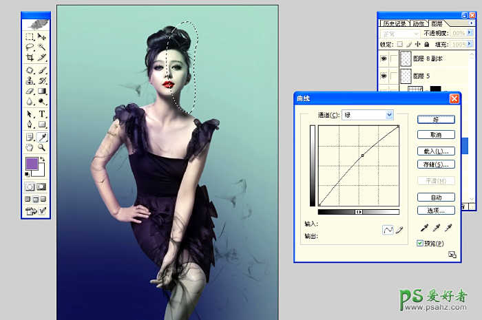 14建立蒙蔽 用L工具在人物图层脸部选取曲线 提绿 打造用摄影灯加色片才能拍出来的对比光颜色\