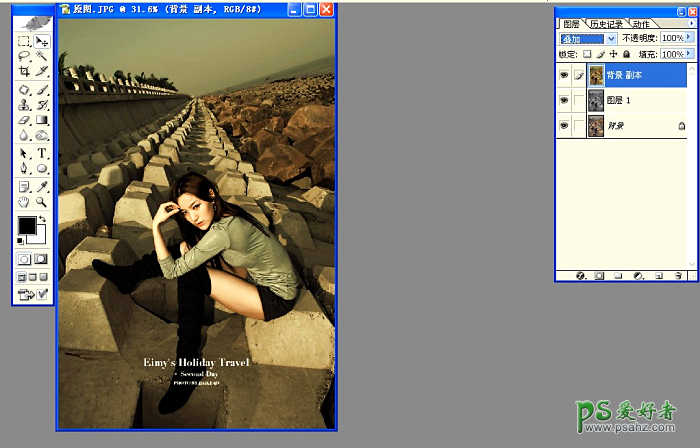 4.把人物图层正常调成叠加图片会变的更透把正常调成柔光让照片通透亮丽.这种效果最简单最实用