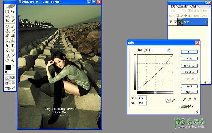 5.曲线选择红色通道压红整体颜色会发微青复古的黄颜色更干净有效的减去了照片中整体的红色这种减红的方法简单快捷