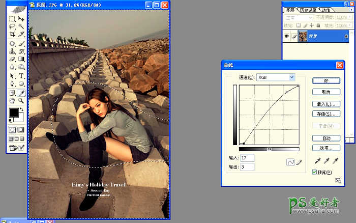 2.我们用套索工具圈出选区保护人物原色执行图文曲线让照片更透一些一定要按图文曲线执行用别的方法调透的话死角会出现太多会影响照片美感