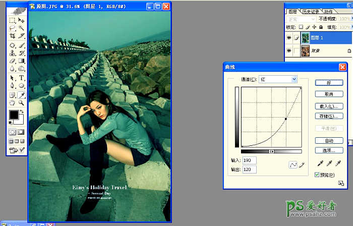 3.整体调整曲线选择红色通道压红照片背景会显示青色人物脸上泛黄有效的减去了照片中整体的红色这种减红的方法简单快捷