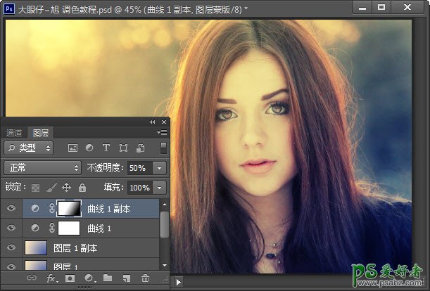 5、复制一层曲线调整图层,调整图层不透明度为50%,选择蒙板层,使用黑白渐变工具进行调整,这一步是加强照片高光处的暖色调,如图。