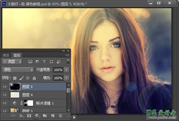 12、设置该图层的混合模式为滤色,这一步是制作镜头效果,如图。