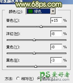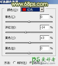 3、创建可选颜色调整图层,对红、黄、绿、中性、黑进行调整,参数设置如图5 - 9,效果如图10。这一步把背景部分的黄绿色转为橙红色。