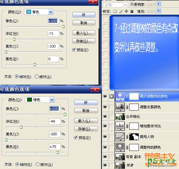 7、新建可选颜色调整图层,对青,绿进行调整,主要调整树的颜色,参数设置如下图。