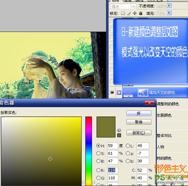 8、按Ctrl + Alt + ~ 调出高光部分选区,新建一个图层,填充颜色:#77762E,图层混合模式改为“强光”,填充改为:72%,效果如下图。
