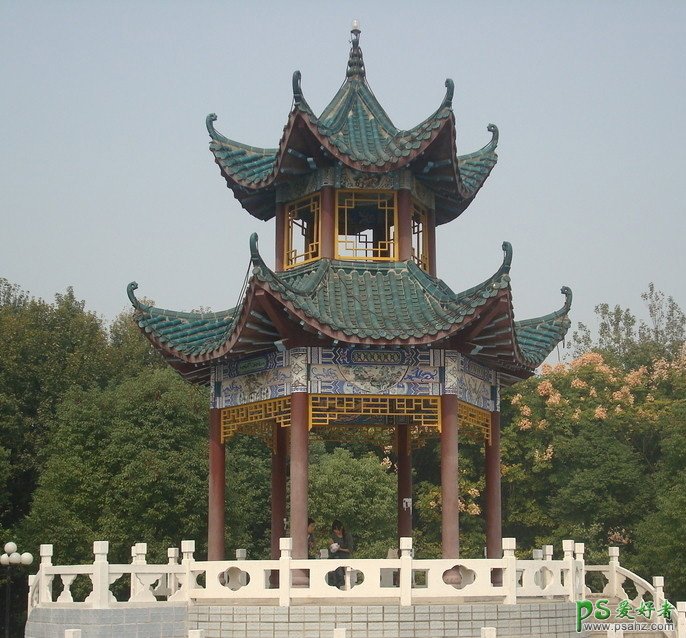 7、打开亭子素材,用钢笔抠出来,移到树木前面,适当调整大小及颜色,效果如图11。