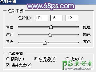 5、调出当前图层蒙版选区,创建色彩平衡调整图层,对中间调,高光进行调整,参数设置如图12,13,确定后把图层不透明度改为:30%,效果如图14。这一步微调人物肤色。