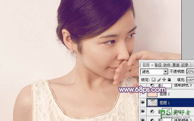 5、按Ctrl + Alt + 2 调出高光选区,按Ctrl + Shift + I 反选,新建一个图层填充暗红色:#8E807F,混合模式改为“滤色”,不透明度改为:20%,效果如下图。这一步适当增加图片暗部亮度。