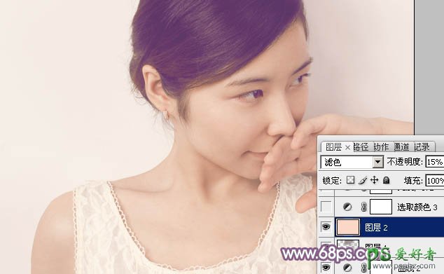 6、新建一个图层填充淡红色:#FBD7C7,混合模式改为“滤色”,不透明度改为:15%,效果如下图。这一步给图片增加亮度。