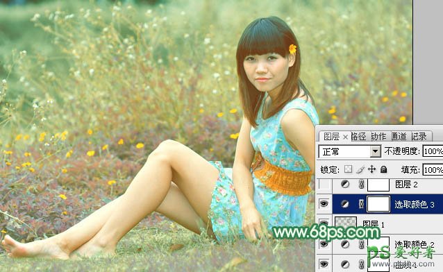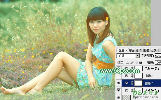 PS后期调色教程:给草地上清纯的少女艺术照调出柔和的小清新黄绿