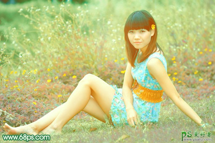 PS美少女照片调色教程,PS后期调色教程:给草地上清纯的少女艺术照调出柔和的小清新黄绿色,小清新色越来越流行,这种颜色风格接近韩系颜色。只是整体画面更加柔和,淡雅,并且以外景图片为主。可以多浏览一下相关的效果图,找出自己喜好的颜色再调色。