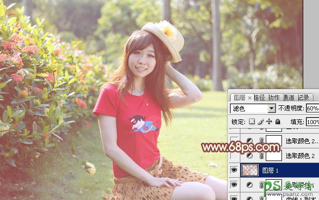 4、按Ctrl + Alt + 2 调出高光选区,按Ctrl + Shift + I 反选,新建一个图层填充暗红色:#BF7E6B,混合模式改为“滤色”,不透明度改为:60%,效果如下图。这一步给图片暗部增加红色及亮度。