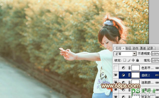 PS给春日绿树边上的清新少女艺术照调出柔和的橙黄色
