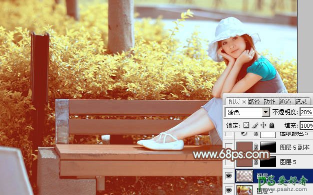 11、按Ctrl + Alt + 2 调出高光选区,按Ctrl + Shift + I 反选,新建一个图层填充红褐色:#936051,混合模式改为“滤色”,不透明度改为:20%,效果如下图。这一步适当增加图片暗部亮度。