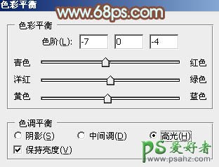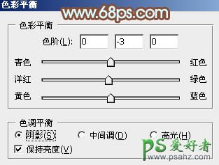 4、创建色彩平衡调整图层,对阴影,高光进行调整,参数设置如图13,14,效果如图15。这一步微调暗部及高光部分的颜色。