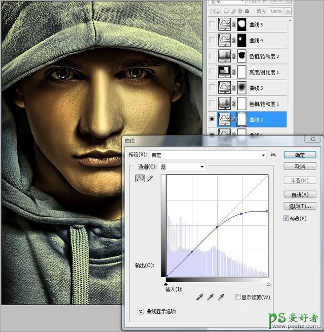 4、使用“曲线”工具对蓝色通道进行调整,这样会使画面适当变黄,因为刚才使用HDR滤镜时,高光区域稍稍有些过曝,所以这里要找回一些亮部细节。