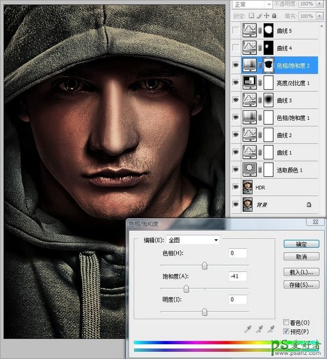 8、要使整个画面显得饱满,必须有一些颜色上的对比,比如冷和暖,白与黑。这里就是用服装的颜色和人物的肤色形成冷暖对比。使用“色相/饱和度”工具降低全图的饱和度后,将人物的肤色还原即可。