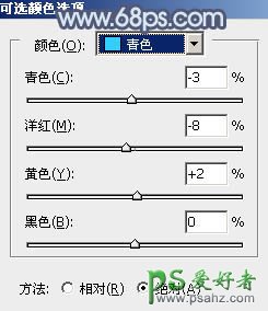 11、创建可选颜色调整图层,对青,白进行调整,参数设置如图26,27,效果如图28。这一步微调背景颜色。