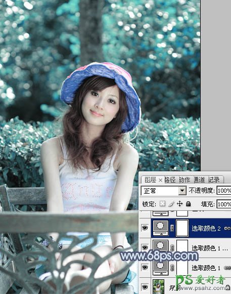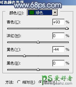3、再创建可选颜色调整图层,对绿色进行调整,参数及效果如下图。这一步减少图片中的绿色,增加青色。