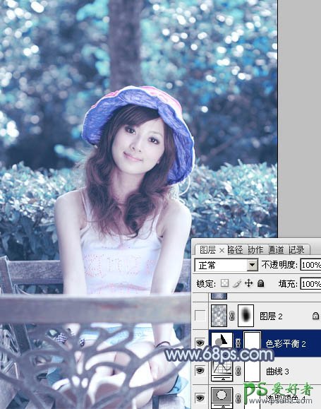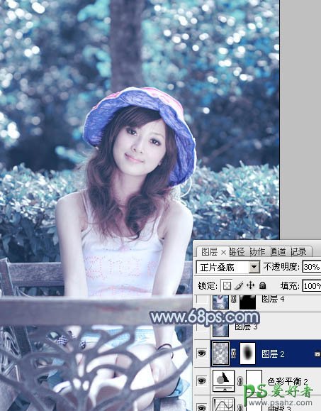 8、按Ctrl + Alt + 2 调出高光选区,按Ctrl + Shift + I 反选,新建一个图层填充暗蓝色:#394F70,混合模式改为“正片叠底”,不透明度改为:30%,取消选区后添加图层蒙版,用黑色画笔把中间部分擦出来,效果如下图。这一步给图片增加暗角。