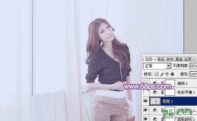 5、按Ctrl + Alt + 2 调出高光选区,按Ctrl + Shift + I 反选,新建一个图层填充暗蓝色:#726A92,不透明度改为:30%,效果如下图。这一步给图片的暗部增加蓝色。