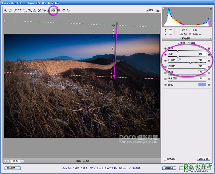 天空太亮,需要压暗。 在工具栏中选中渐变滤镜。在天空中从上向下拉出渐变线。在参数区调整参数,降低曝光和亮度参数,看到天空暗下来了,提高饱和度参数天空的颜色好看了。 可以适当设置颜色,让天空的蓝色更鲜亮一些。