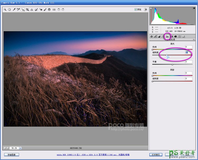 打开直方图上的高光和阴影修剪警告。原片欠曝,在基本调整参数区中,提高曝光1.5挡。天空过曝了,把“恢复”滑标右移,直到高光过曝消失。降低“黑色”参数,草丛中欠曝部分消失。提高了对比度和色彩饱和度,现在片子看起来有点模样了。
