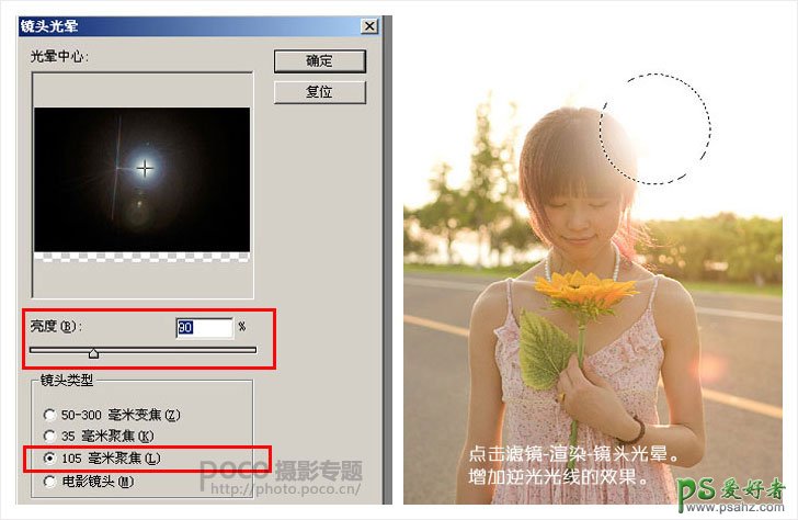 照片是用RAW格式保存的,把它拖到PS CS5中会自动进入ACR中,然后对画面进行初步调节,主要是降低透明度-20,让光线更趋向柔和唯美,调高细节饱和度+20,增加色彩。 二、加入镜头光晕 1、用白色画笔在头部与太阳接洽处点一个光晕,增加逆光的强度。 2、新建图层,填充黑色。转换为智能滤镜(方便下一步滤镜的调整)。 3、点击滤镜-渲染-镜头光晕。增加逆光光线的效果。