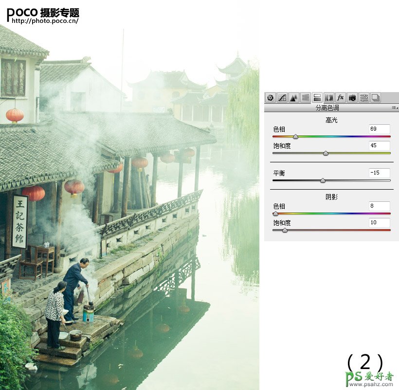 接着我们来调整列表里的第五项,分离色调,这个功能很方便的给照片的高光和阴影部分添加色彩倾向,高光部我加入了大量的黄色,来传递怀旧的感觉,暗部略加了一点点红,来平衡刚才过分的蓝绿偏色感觉。