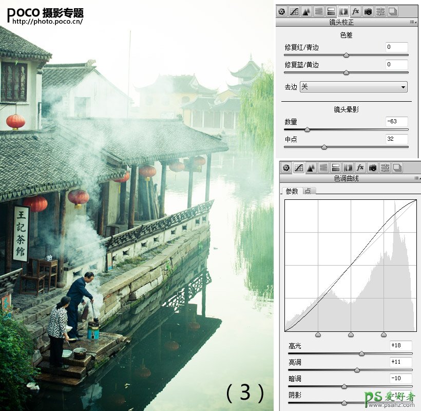 最后要重点调整的是色温和色调,准确的色温应该是4700,可是希望凸显清幽的水乡清晨感觉,因此强行降低为3700,整个画面就偏蓝了,色调减22,画面开始偏绿,这种蓝绿的色调,很适合这张照片。