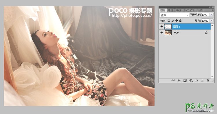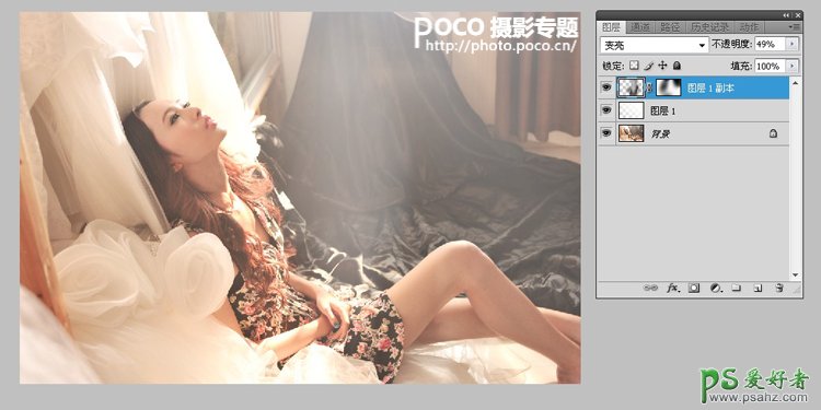 新建空白图层,用白色画笔工具涂抹,擦出一缕阳光的感觉,降低透明度到49%,图层叠加模式改成变亮。