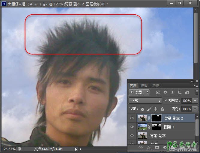 7、扣出的头发比较差,所以我们复制原照片,放置在顶层,为其添加图层蒙板,用白色画笔擦出头发部分,如图。