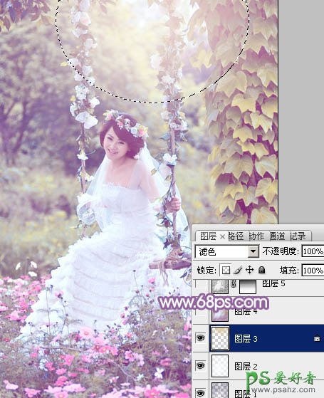 10、新建一个图层,用椭圆选框工具拉出下图所示的椭圆选区,羽化60个像素后填充橙黄色:#DBCDA2,混合模式改为“滤色”,效果如下图。这一步给图片增加高光。