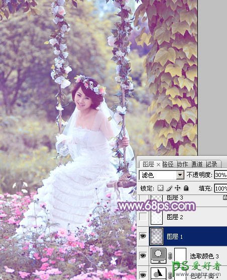 8、按Ctrl + Alt + 2 调出高光选区,按Ctrl + Shift + I 反选,新建一个图层填充暗蓝色:#573B7C,混合模式改为“滤色”,不透明度改为:30%,效果如下图。这一步给图片暗部增加蓝色。