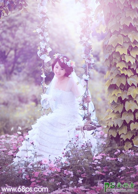 ,给荡秋千的少女婚片调出淡调蓝黄色,处理这张美女婚片的时候可以适当把整体色调调亮,再把高光部分的阳光效果渲染出来,最后再调出自己喜欢的颜色,色彩,色调就可以了。