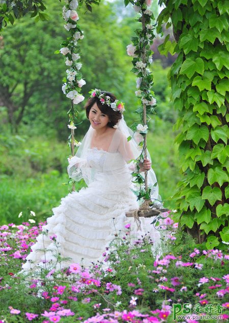 PS婚片后期调色,给荡秋千的少女婚片调出淡调蓝黄色
