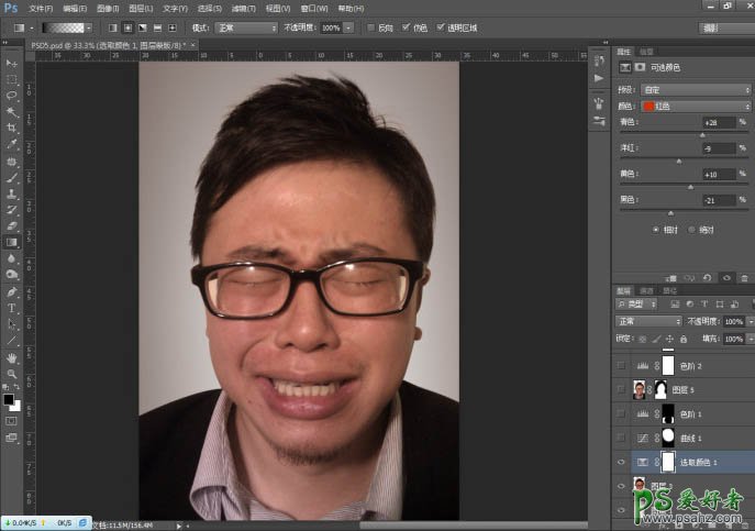 8、观察原图可见人物额头部位颜色过黄,而人物面部更有多处淤红,新建选取颜色调整图层,分别对红色、黄色进行编辑,具体参数不截图,这里主要讲操作目的。