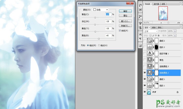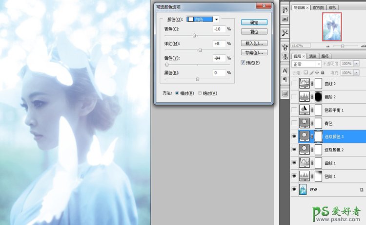 4:调整可选颜色中的白色(相对) 使人物背景及装饰的纸蝴蝶更明亮通透