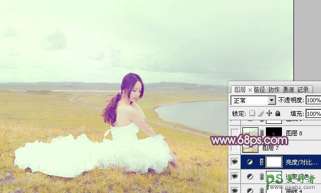 Photoshop给草原上的性感美女婚纱照调出清新黄调效果
