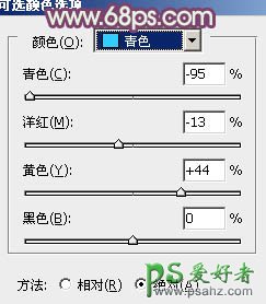 3、创建可选颜色调整图层,对绿、青、白进行调整,参数设置如图7 - 9,效果如图10。这一步给草地增加黄绿色,天空部分增加青绿色。