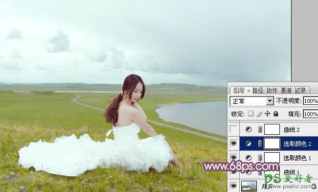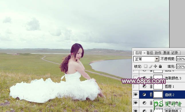Photoshop给草原上的性感美女婚纱照调出清新黄调效果