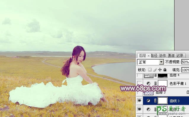 8、创建曲线调整图层,对红、绿、蓝通道进行调整,参数设置如图19,确定后把图层不透明度改为:50%,效果如图20。这一步主要给图片增加红色。