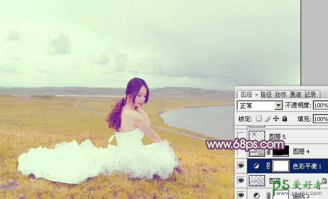 Photoshop给草原上的性感美女婚纱照调出清新黄调效果