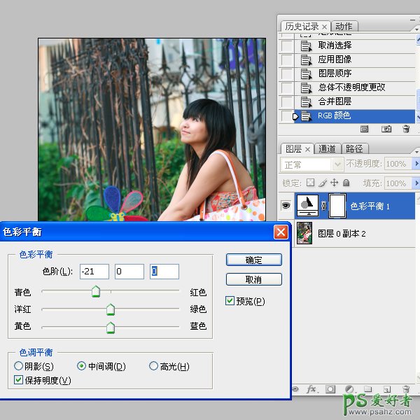 步骤4:调色后的图层不透明度为70%,合并所有图层,选择图像-调整-RGB颜色,转回到RGB颜色模式,添加一个色彩平衡调整图层,