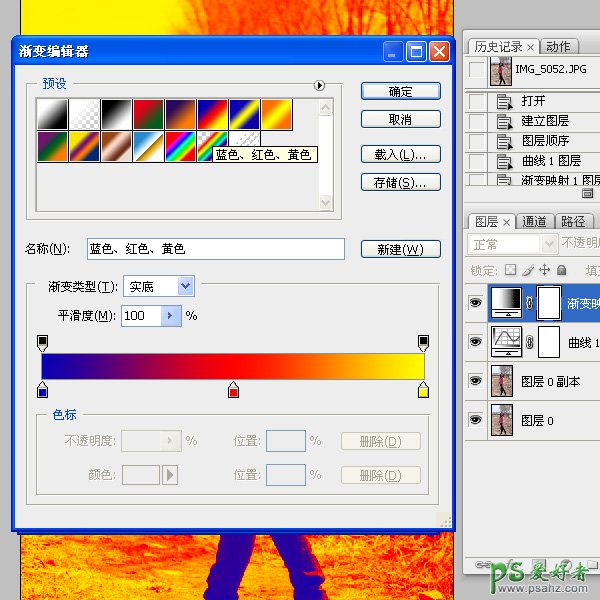 步骤2:渐变映射默认是黑白渐变,点击黑白渐变,选择这个三色渐变,如图: