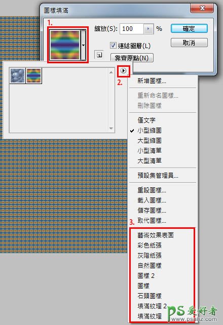 2、Photoshop里头原本的设定只有两种图样,再依照下面步骤把其它内建图样也叫出来。将所有内建的图样,选取加入。