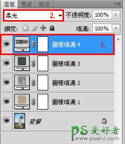 10、依下图步骤新增/图案,选择“带有白色斑点的米黄色纸”材质。将材质混合选项选择“滤色”。