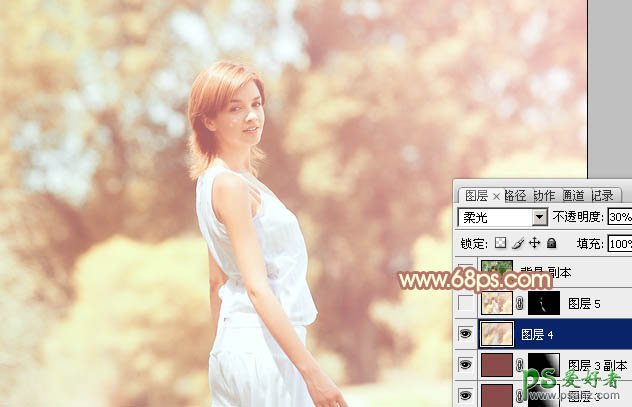 11、新建一个图层,按Ctrl + Alt + Shift + E 盖印图层。执行:滤镜 > 模糊 > 动感模糊,角度设置为-45度,距离设置为150,确定后把图层混合模式改为“柔光”,不透明度改为:30%,效果如下图。这一步简单把图片柔化处理。