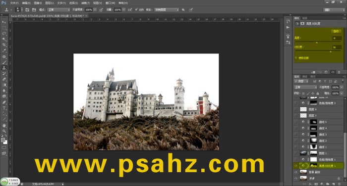 2.添加一个亮度对比度调整图层,具体参数如图所示。做这一步的目的是要把明暗层次更好的体现出来,参数设置后需在蒙板上将调整过暗的地方给擦回来,还有天天空白墙以及比较野草头部高亮的部分都给擦回来保留原样。